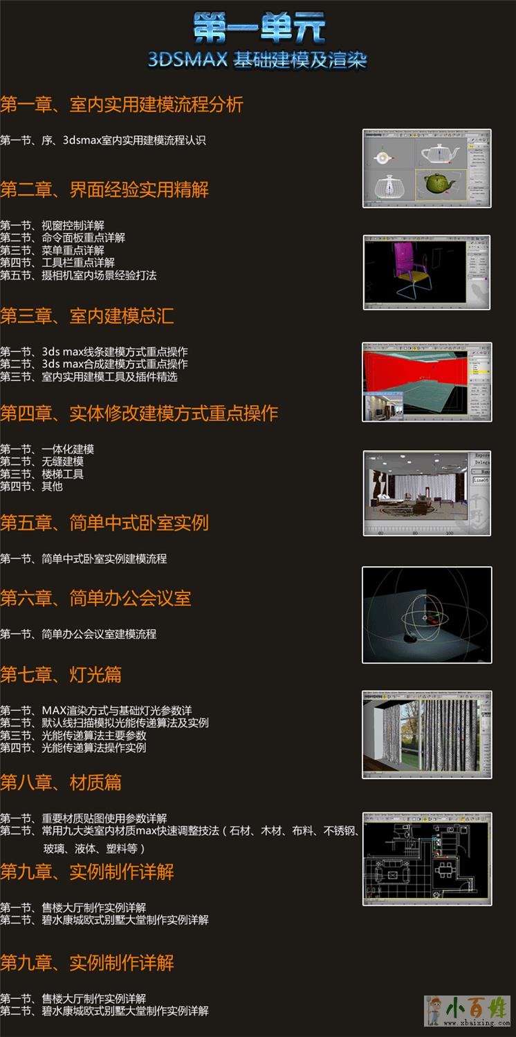 1、初识3DsMax:软件界面的介绍、常用的命令讲解;2、三维对象的创建与基本操作;3、二维线的创建与编辑;4、多边形建模技术;5、材质与贴图系统;6、灯光系统、摄像机系统与渲染;7、地中海风格综合案例详解;8、现代简约风格综合案例详解